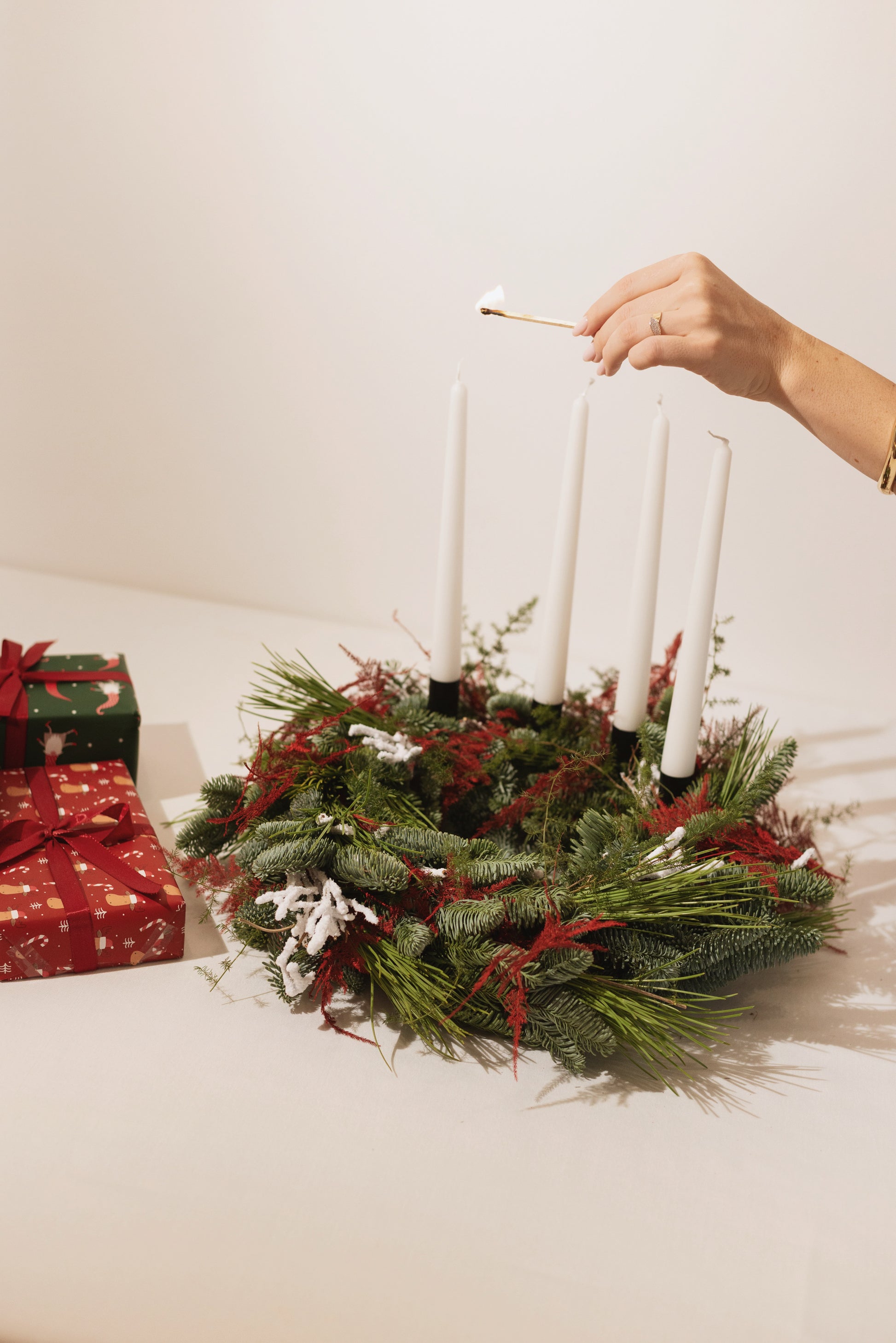 Christmas Wreath je moderen poklon klasičnim prazničnim venčkom. Smreka in bor ustvarita bogato, naravno osnovo, barvana borovnica doda trendovski barvni poudarek, asparagus pa poskrbi za zračno, elegantno teksturo.