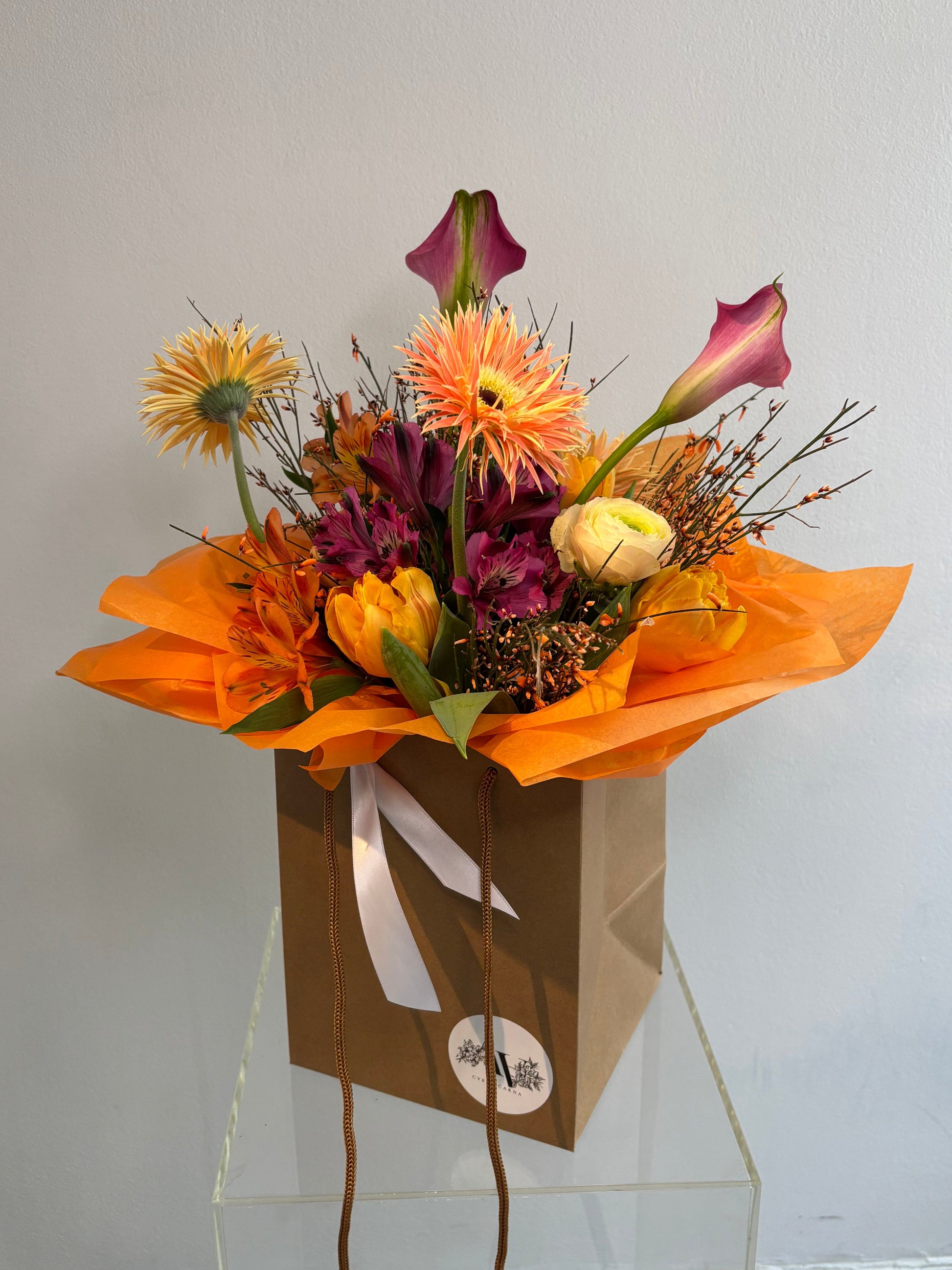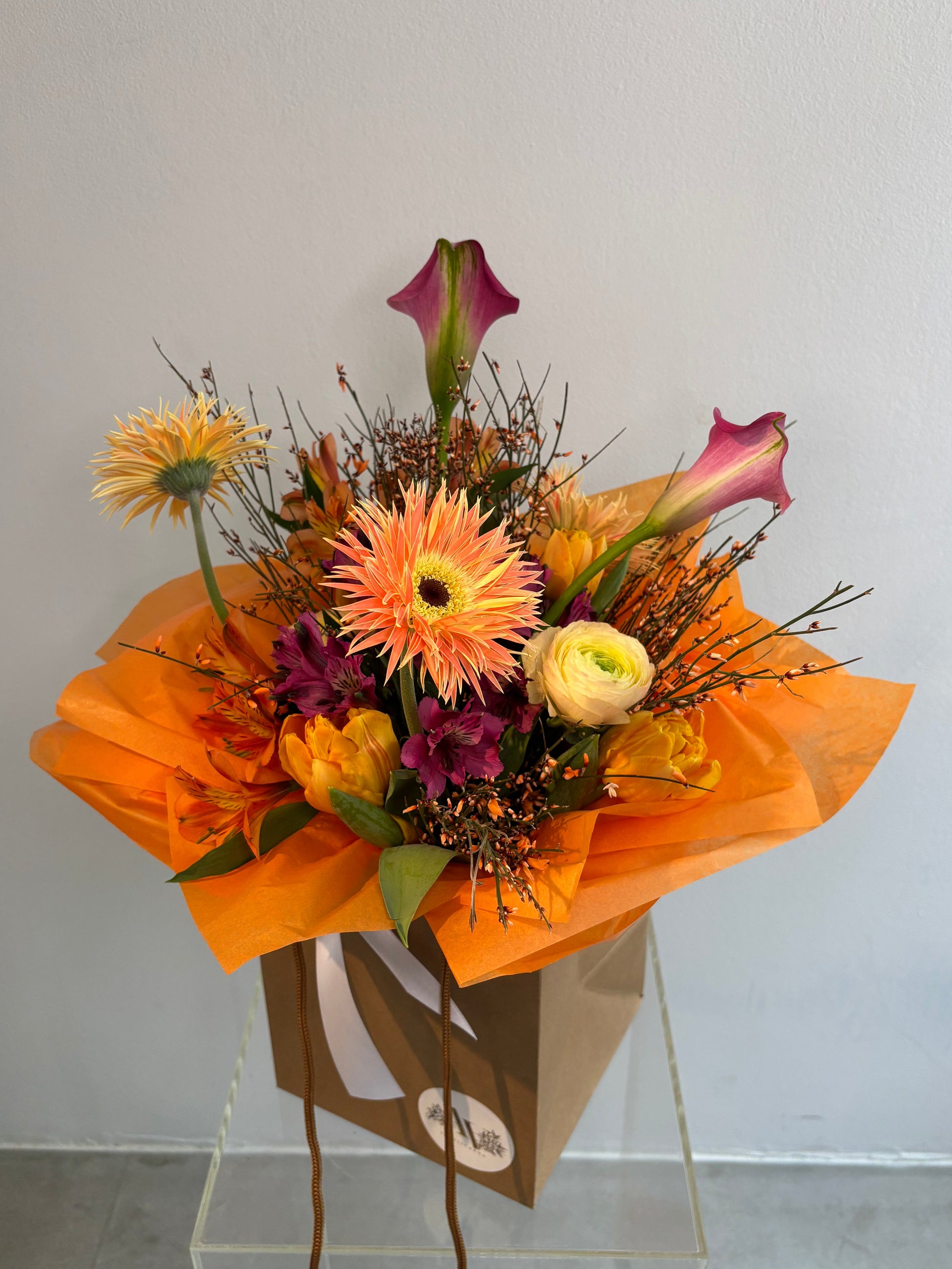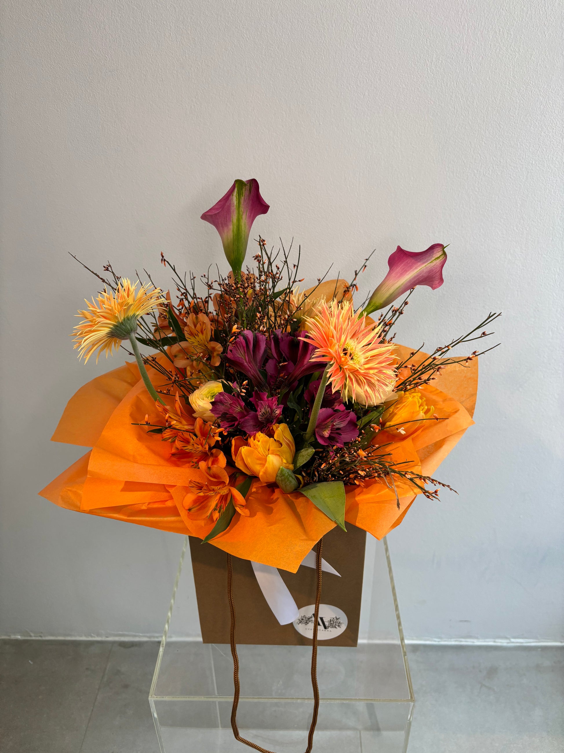Združuje močne in očarljive barve – od oranžne do globoke temno roza, ki skupaj ustvarjajo dinamično in elegantno kombinacijo. Ta šopek bo popoln dodatek vsakemu prostoru, saj njegova barvna harmonija prinaša energijo in svežino. Idealno za posebne priložnosti ali kot osvežitev doma, kjer bo zagotovo pritegnil pozornost.