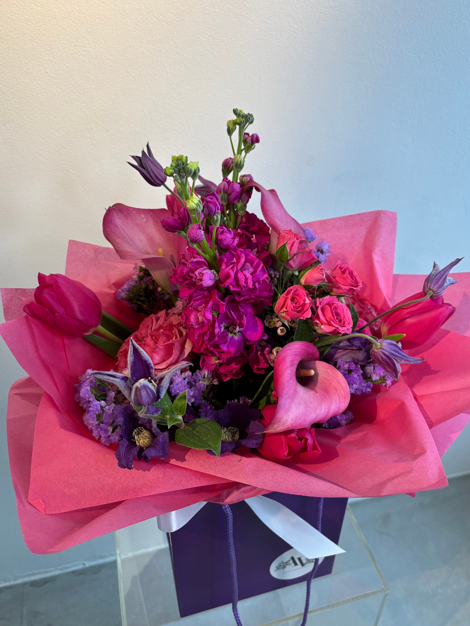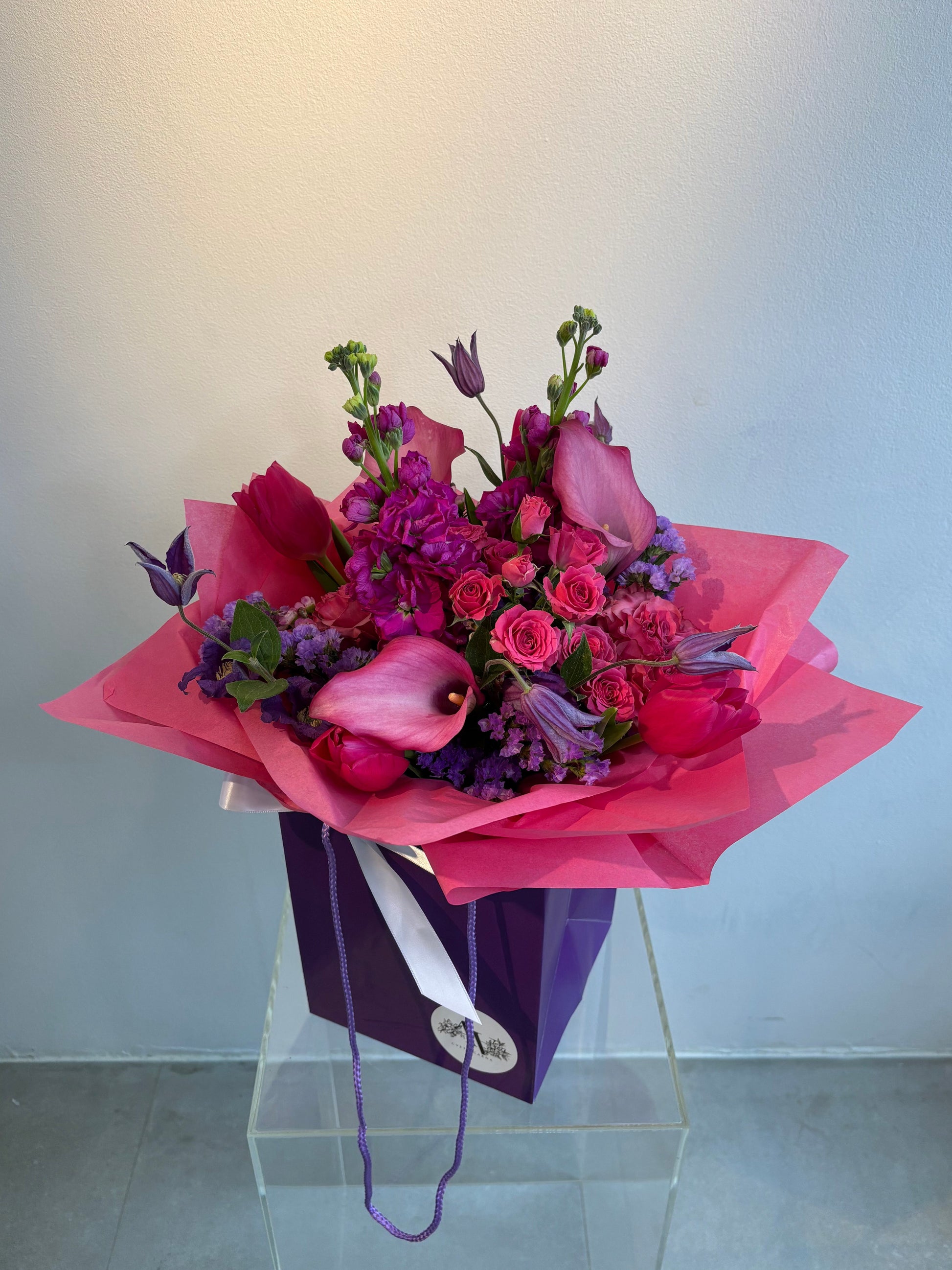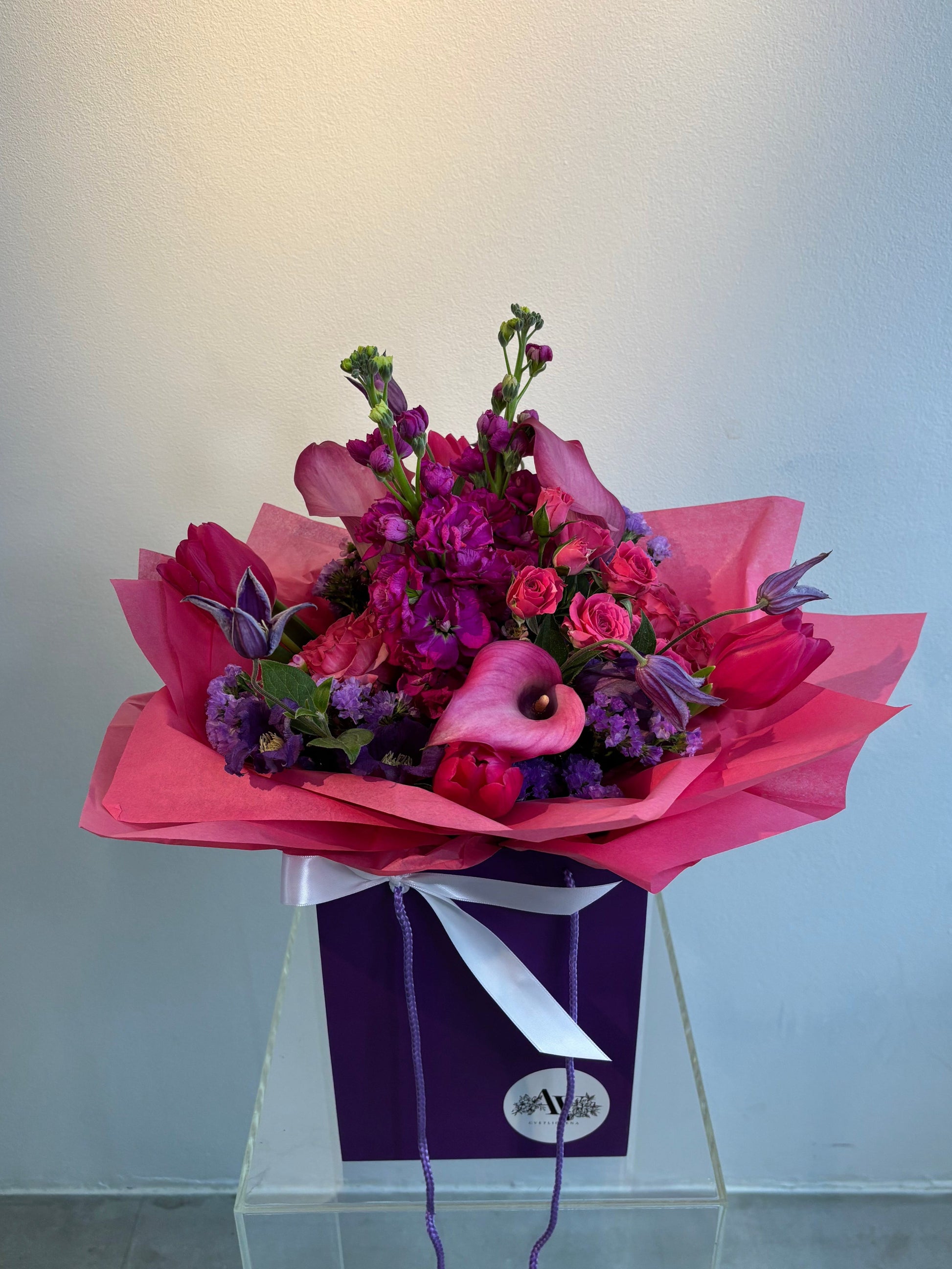 Med izdelavo izbiramo sveže cvetje, zato so lahko vrste cvetja drugačne kot na sliki. Količina rož in posledično velikost šopka, se razlikujejo glede na ceno šopka. Šopek na sliki je pripravljen v vrednosti 65 EUR.