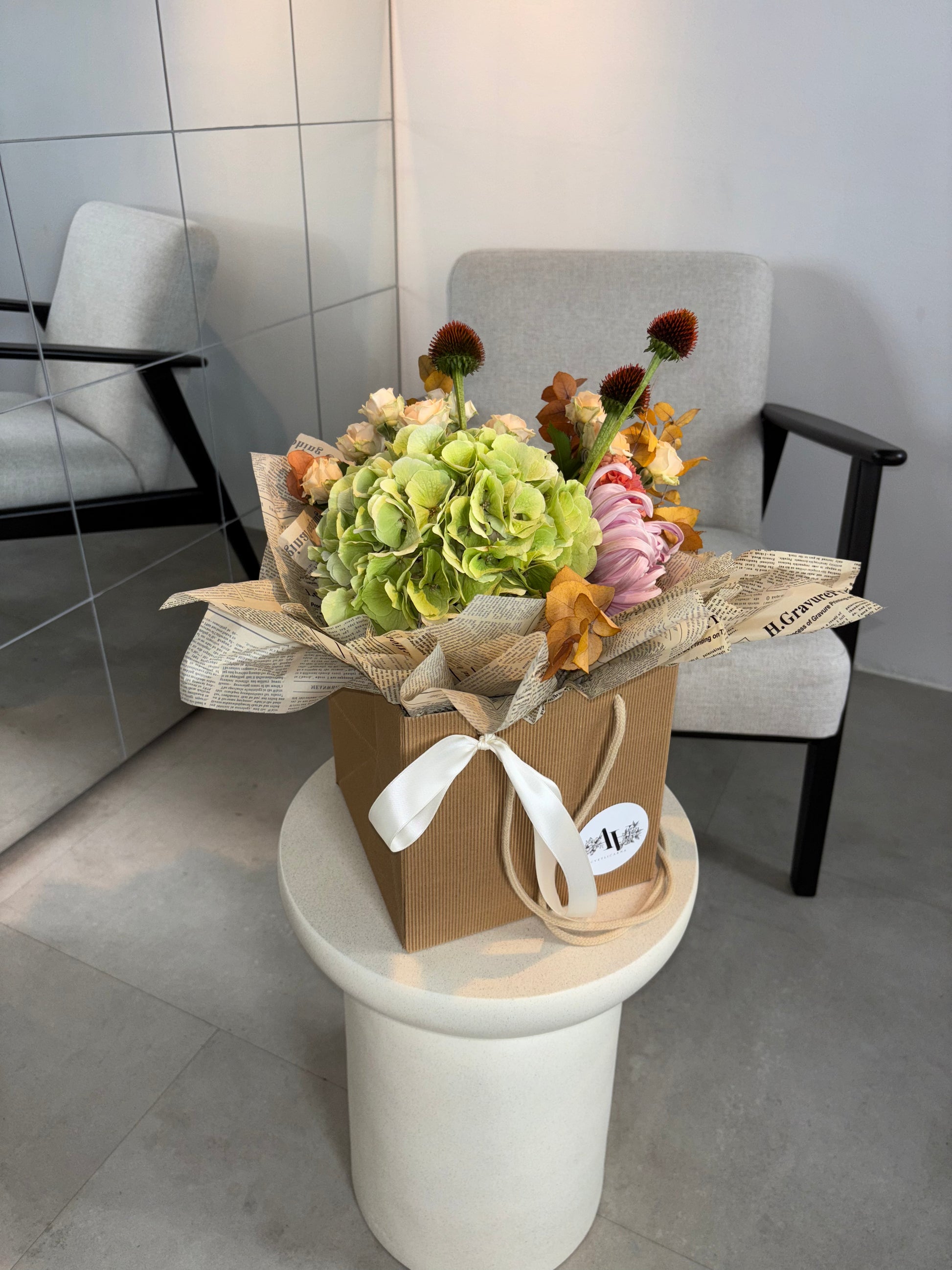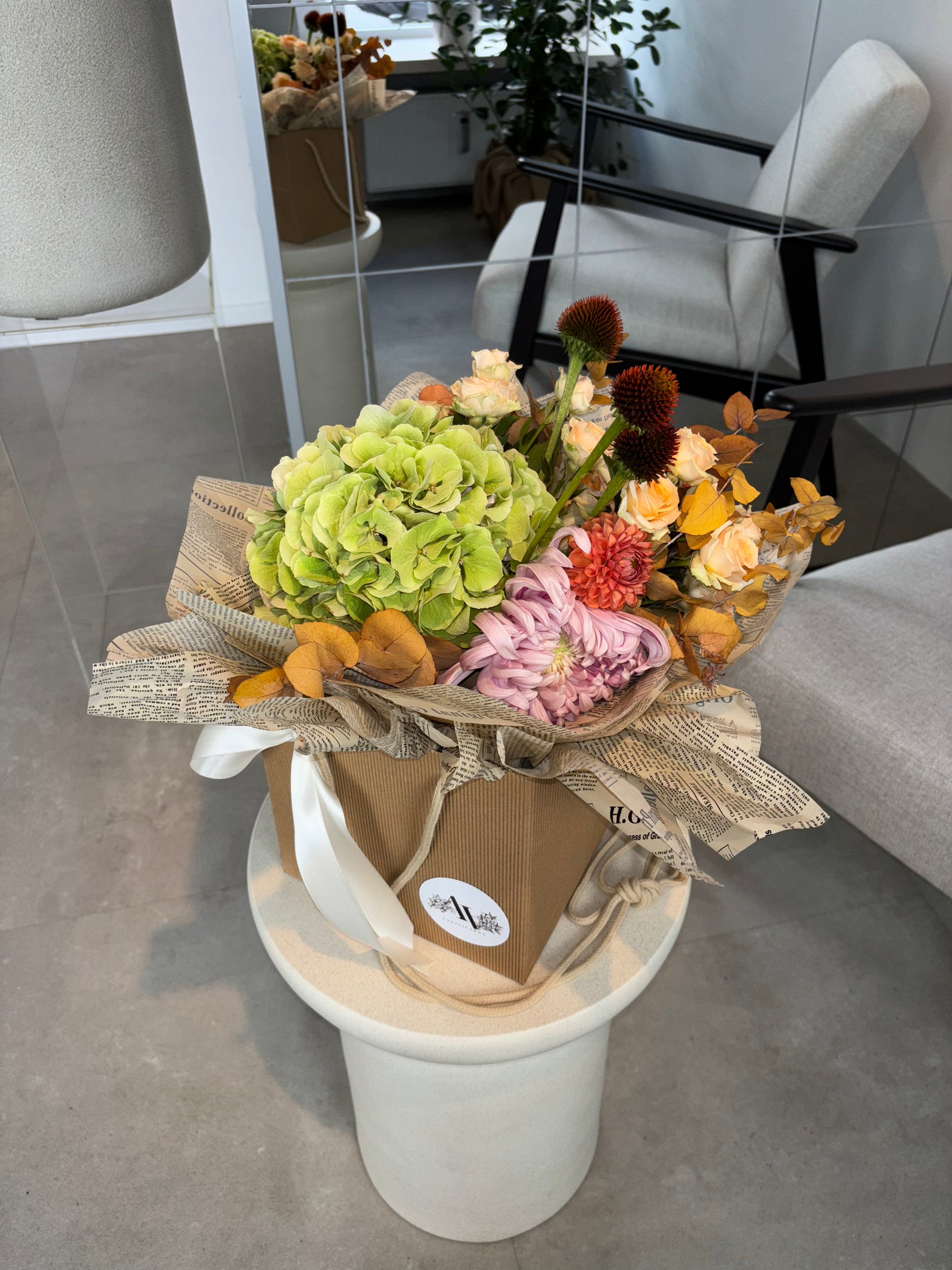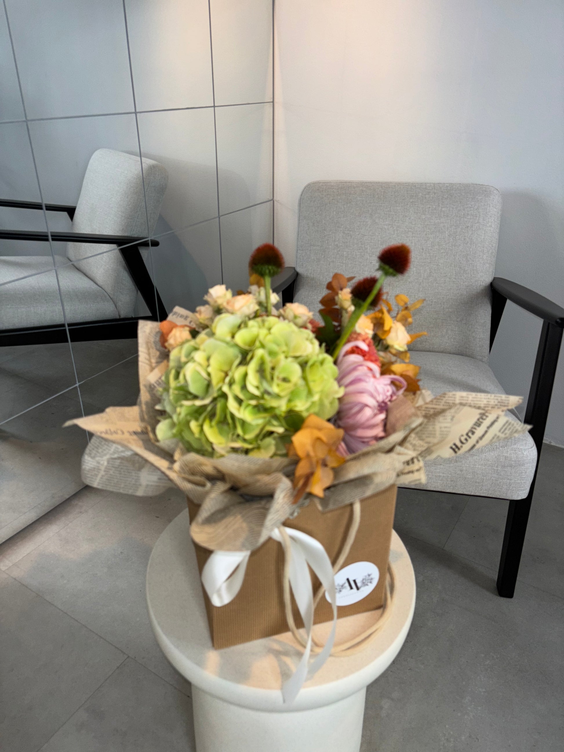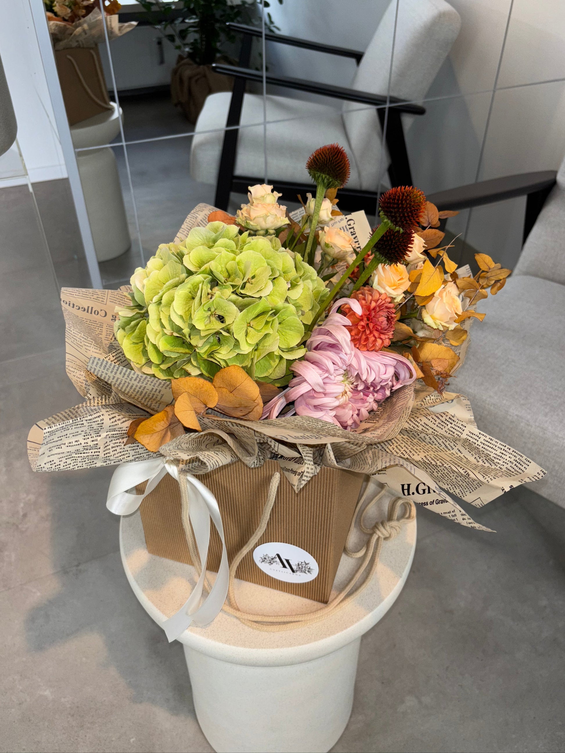 Med izdelavo izbiramo sveže cvetje, zato so lahko vrste cvetja drugačne kot na sliki. Količina rož in posledično velikost šopka, se razlikujejo glede na ceno šopka. Šopek na sliki je pripravljen v vrednosti 55 EUR.